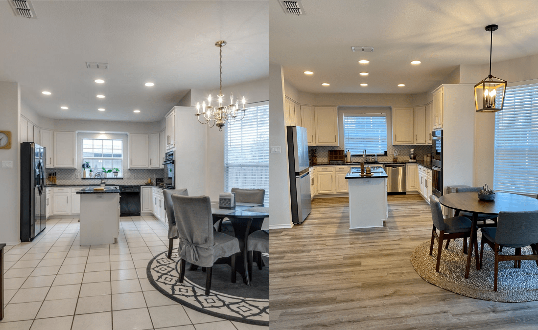 The kitchen cabinets and countertops had been refinished and replaced (white cabinets with charcoal counters), the popcorn ceiling had been removed, and the fluorescent lighting had been replaced with can lights. What remained untouched were the floors, appliances, and lighting fixture above the kitchen table.
